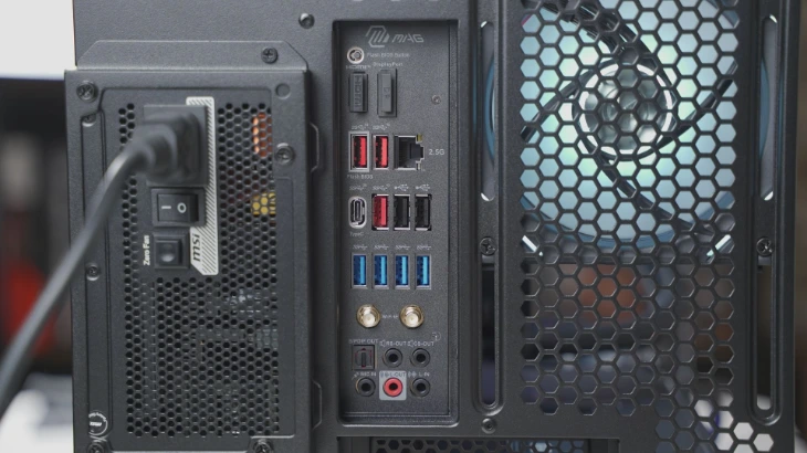 3. Branchement des périphériques et autres connecteurs : Ton clavier et ta souris se branchent sur les connecteurs USB disponibles à l'arrière de la tour. D'autres connecteurs sont également disponibles et te seront utiles selon la configuration de ton setup et les périphériques dont tu disposes.